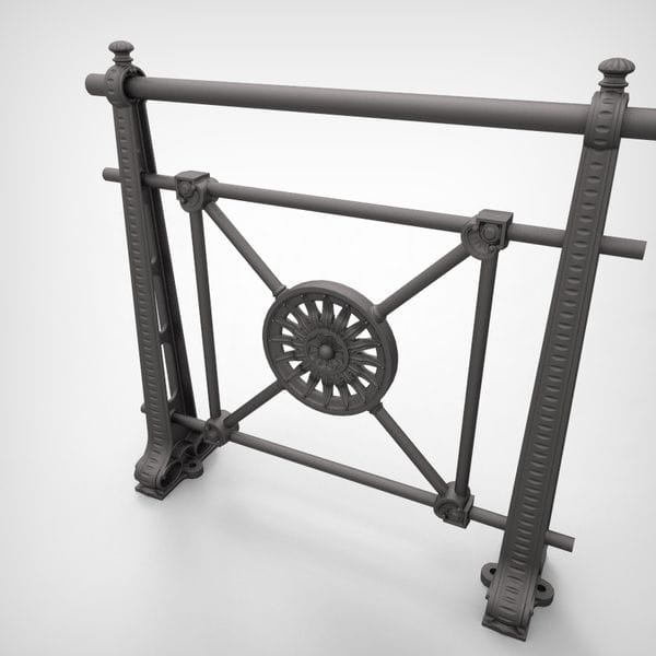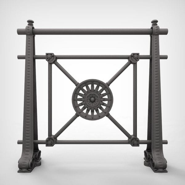 Piękna artystyczna balustrada wykonana z żeliwa. Dzięki swojemu uniwersalnemu wyglądowi balustrady mogą być stosowane zarówno w starszych, jak i nowoczesnych dzielnicach miasta, malowana proszkowy na kolor czarny. Balustrada historyczna jest jednym z elementów małej architektury. Do balustrady można dokupić żeliwne słupki mocujące.